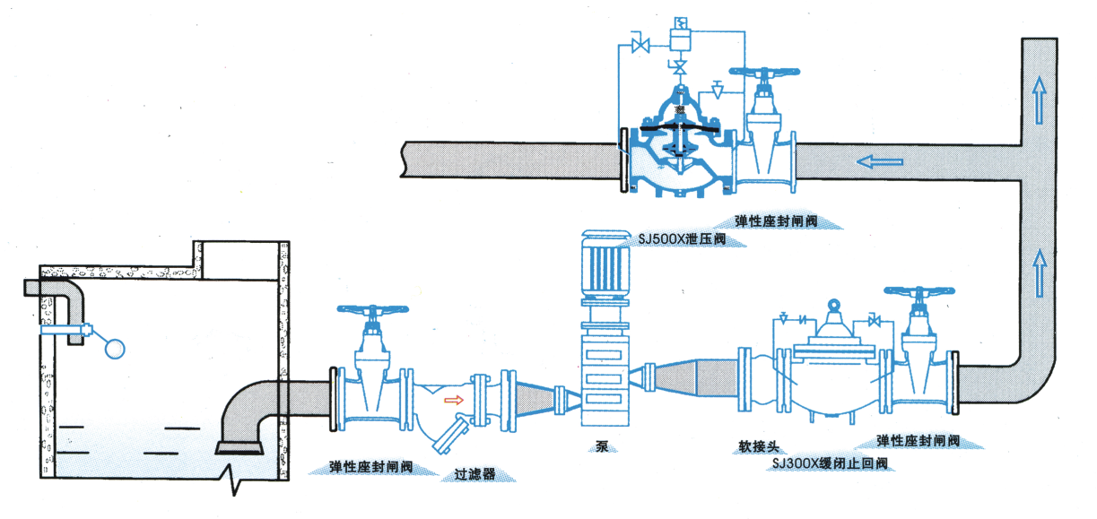 該閥主要用于管路系統中,以防止管路系統超壓或維持管路的壓力,當泵關閉后還可以減少水錘沖擊。也可用于大型供水系統的水錘消除裝置,并且閥門控制系統的進口處裝有一個自清洗濾網,利用流體特性,使比重較大、直徑較大的懸浮顆粒不會進入控制系統,確保主閥的上游供水壓力某一設定值上使系統循環暢通無阻,該閥起閉靈敏、安全可靠、動作平穩、使用壽命長.