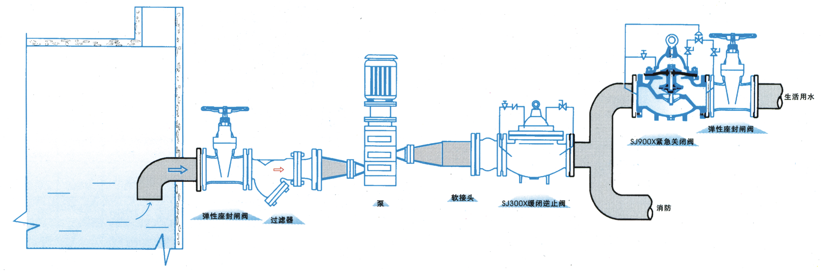 該閥用于生活供水和消防供水并聯(lián)供水系統(tǒng)中,正常情況供生活用水,當(dāng)火災(zāi)發(fā)生時消防用水時,閥門自動關(guān)閉生活用水,確保足夠