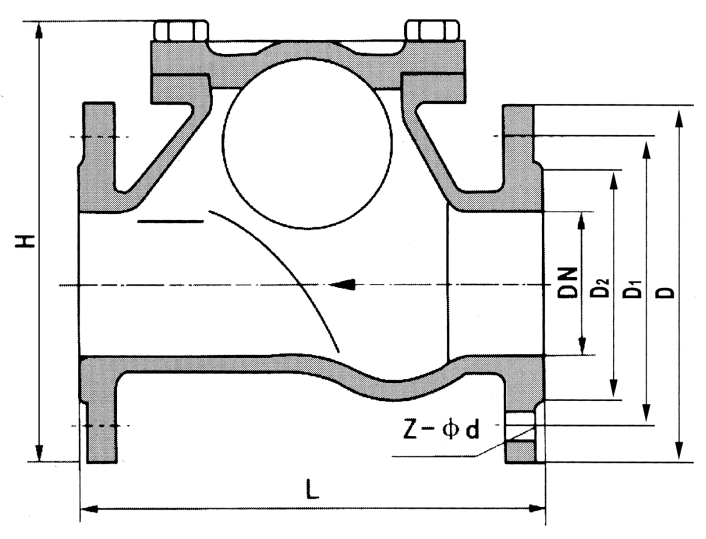 滑道滾球式止回閥,采用橡膠包皮滾球為閥瓣,在介質的作用下,可在閥體內的整體式滑道上作上下滾動,從而打開或關閉閥門,密封