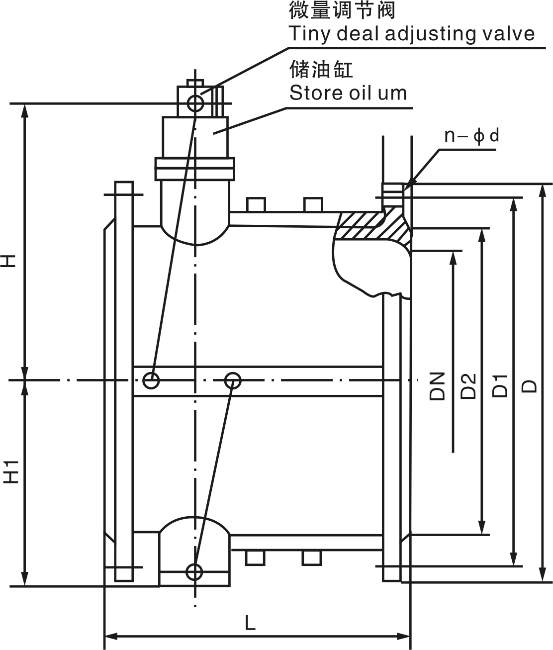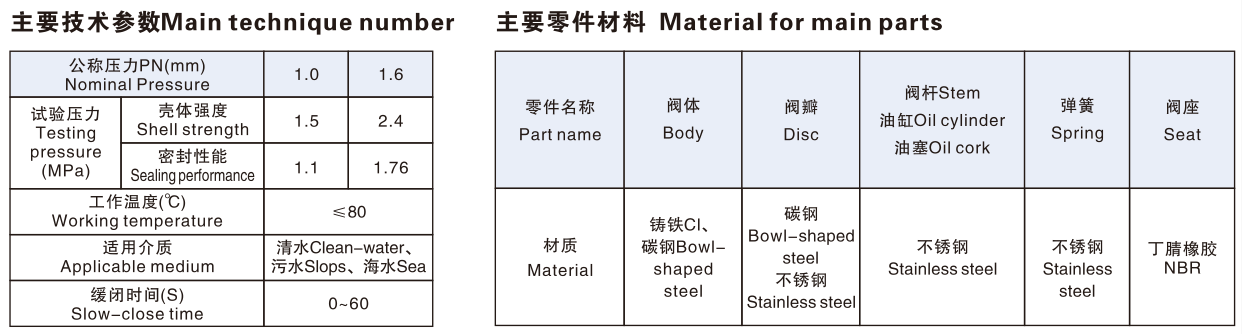 主要由閥體、兩塊半圓閥瓣、回位彈簧、儲(chǔ)油缸、緩閉小氣缸組、針型閥(微量調(diào)節(jié)閥)組成。其原理主要依靠進(jìn)口介質(zhì)的推力作用,將兩塊閥瓣平穩(wěn)推開(kāi)。在此同時(shí),進(jìn)口的壓力介質(zhì)進(jìn)入油缸內(nèi)活塞的下部,推動(dòng)活塞,將活塞上部的油通過(guò)針型閥分別壓入閥體兩側(cè)的小氣缸尾端,使小氣缸內(nèi)的活塞桿伸出。當(dāng)進(jìn)口介質(zhì)壓力下降低于出口壓力時(shí),介質(zhì)將產(chǎn)生回流,此時(shí)閥瓣在彈簧和介質(zhì)回流的作用下,將自動(dòng)關(guān)閉。但由于活塞桿處于伸出的位置,頂住閥瓣不能全部關(guān)閉,還剩有20%左右的面積使介質(zhì)通過(guò),從而起到了消除水錘的作用。閥瓣被活塞分成先快速關(guān)閉后緩慢兩步關(guān)閉,達(dá)到既防電機(jī)逆轉(zhuǎn)又起消除靜音作用。
